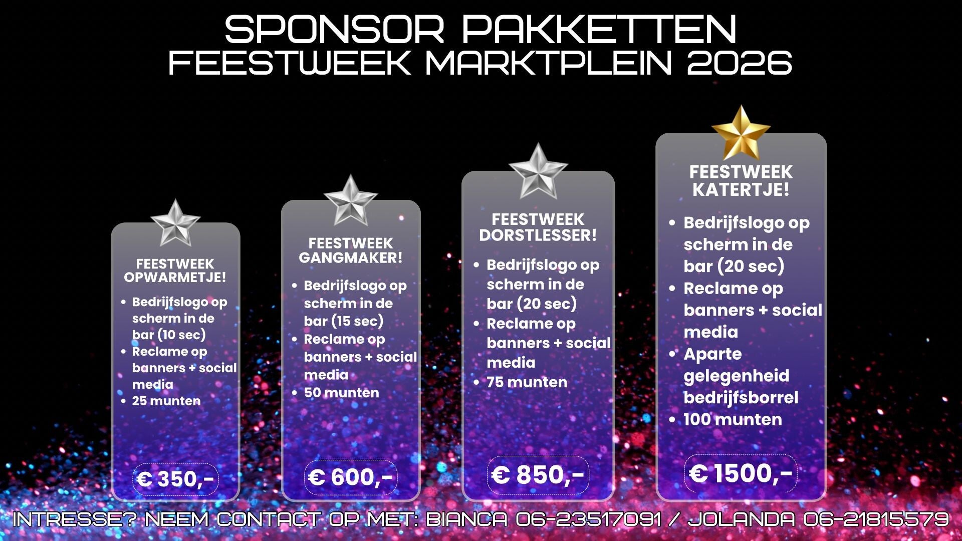 Ook dit jaar bieden wij weer aantrekkelijke sponsorpakketten aan rondom de Feestweek. Een mooie kans om jouw bedrijf zichtbaar te maken tijdens één van de drukstbezochte en gezelligste dagen van het jaar!